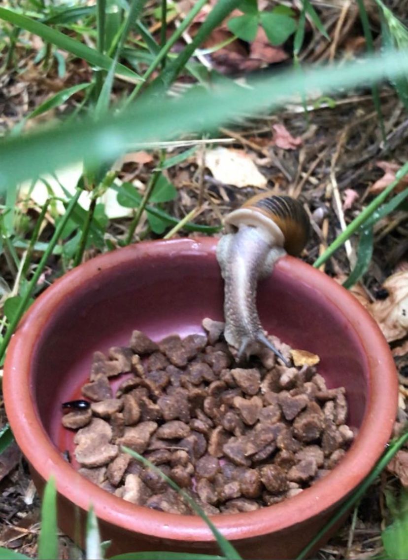 Ancak bu salyangoz, tadını değişik bulmuş ki kedilerden arta kalan mamalara dadanmış. Ortalığı sakin bulan Salyangoz, mama kaplarına uzanıp karnını bir güzel doyurduktan sonra yoluna koyulup gözlerden kayboldu.