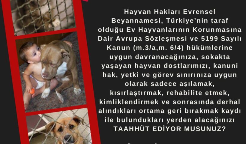 Son günlerde medyaya yansıyan “Sahipsiz hayvanların toplanması” konusundaki haberler üzerine İstanbul’da bir grup Hayvansever, Belediyelere çağrıda bulundu. 5199 sayılı kanun hükümlerine uygun davranılması istenen çağrı.