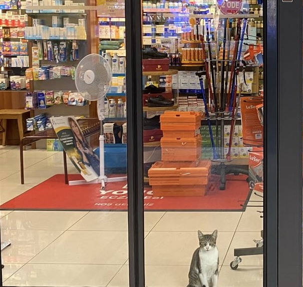 09.00’da başladığından eczanenin kapısı daha açılmamıştı. On dakika vardı. Beklemeyi pek sevmem. İçerde tekir-beyaz bir kedi vardı. Kapının hemen önünde duruyordu. İlgimi çekti. Ben de eğildim. Beni görünce yerde