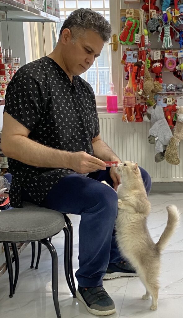 Yeşilköy Green Pet Veteriner kliniğine gelenler onu yakından tanıyor. Tanımamaları imkânsız. Zira veteriner kliniğine gelenler onunla selamlaşmadan ve sohbet etmeden geçemiyorlar. Zira patron koltuğunda o oturuyor; müşterileri karşılıyor mutlaka onlarla ilgileniyor. Ödülünü de mutlaka alıyor. Onun en çok sevdiği de ödül mamaları…